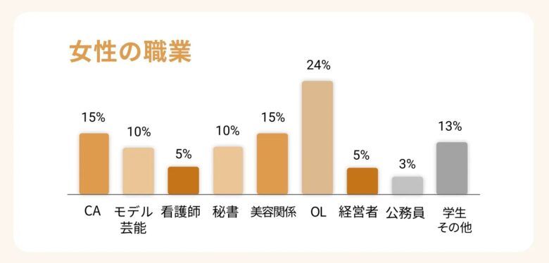 CA・モデル・美容関係など、人気な職業の女性も在籍していますが、一番多いのはOL。つまり一般的な会社員が多いので、華やかな職業でなくても大丈夫です。(私も普通のOL)
