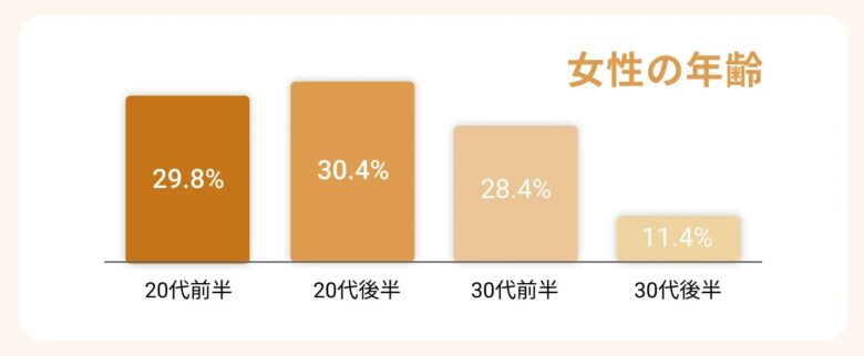 でも、複数の体験談や口コミから40代女性は確実に存在します。(私もいる笑)。おそらくデータでは、30代後半に含まれているのでは?と思うので、全体で見ると10%未満と推測されます。