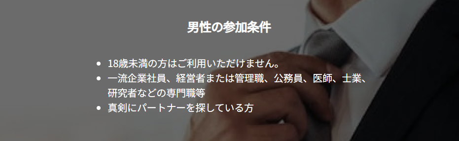 男性の場合は、年収と見た目の清潔感が重要になってきます。年収に関しては年齢とのバランスを考慮しているようで、公務員や士業、有名企業の方であれば、年収が300万円以上で登録できる方もいるようです。