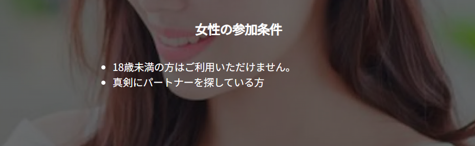 ちなみに、公式サイトに掲載されている「男女の参加条件」は下記になります。女性は超ざっくりですね笑