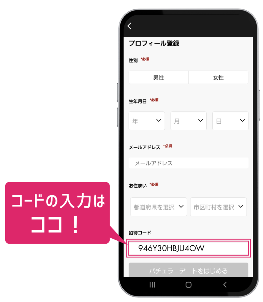 バチェラーデートの招待コードを使って登録する方法